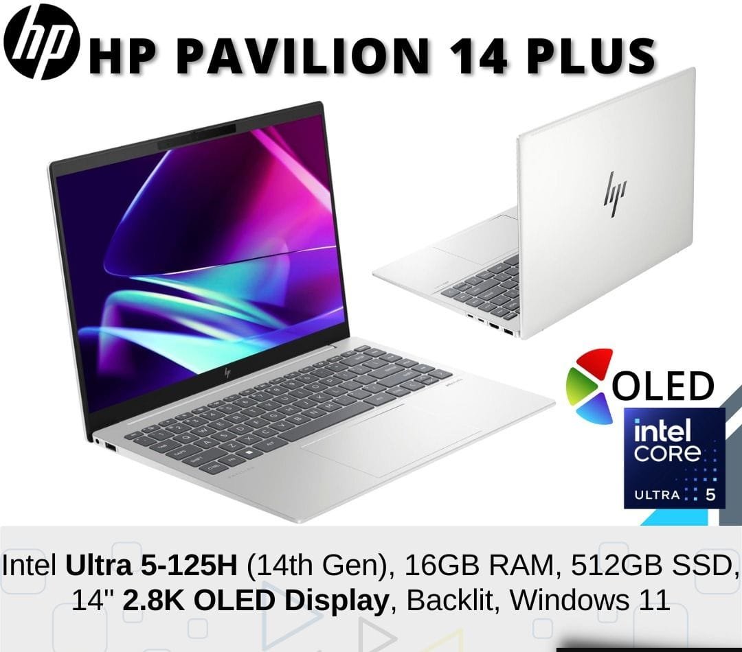 HP Pavilion 14 Plus Laptop Intel Core Ultra 5 14th Gen 125H Processor | 16GB RAM | 512GB SSD | Backlit Keyboard | 14 Inch 2.8K Display www.ktmct.com/details?pro_id=hp-pavilion-14-plus-laptop-intel-core-ultra-5-14th-gen-125h-processor-16gb-ram-512gb-ssd-backlit-keyboard-14-inch-28k-display-580-667-589 @97250